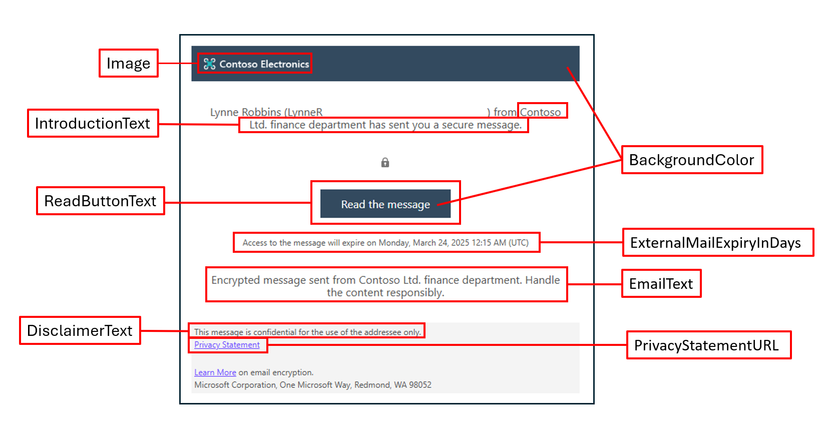 Set-OMEConfiguration -Identity "Default Branding" -DisclaimerText "This message is confidential." -PortalText "Contoso secure portal" -BackgroundColor "#ffffff"