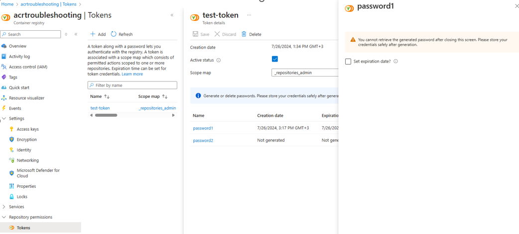 Kapsam haritasıyla ilişkilendirilmiş bir belirteç kullanıyorsanız parola için son kullanma tarihi ayarlanabilir. Son kullanma tarihini görüntülemek için, Belirteç ayrıntılarını göster bölümünde açıklanan Azure CLI komutlarını çalıştırabilir veya belirteci Azure portalında açabilir ve aşağıdaki ekran görüntüsüne göre Süre sonu tarihini de kontrol edebilirsiniz: