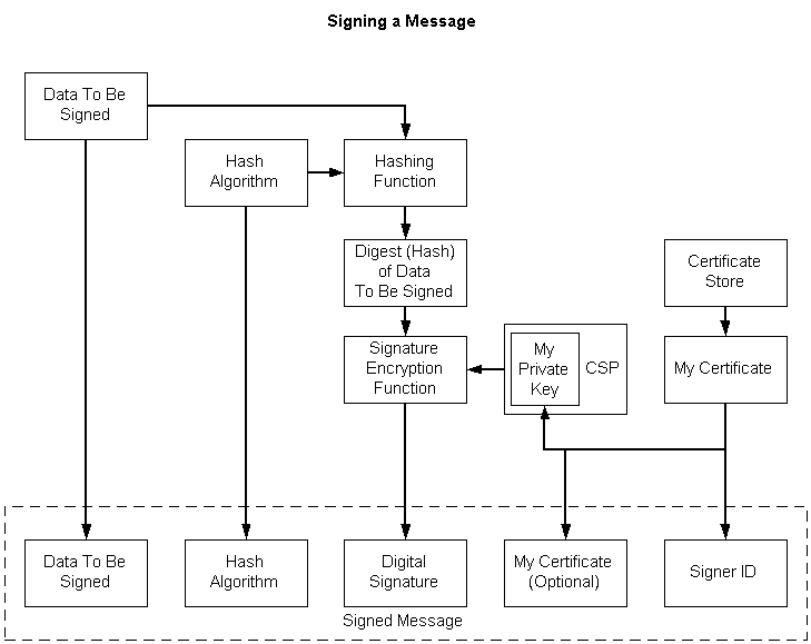 Aşağıdaki çizimde, imzalı ileti oluşturmak için gerçekleştirilmesi gereken görevler gösterilmektedir. Adımlar, çizimden sonra listelenmiştir.