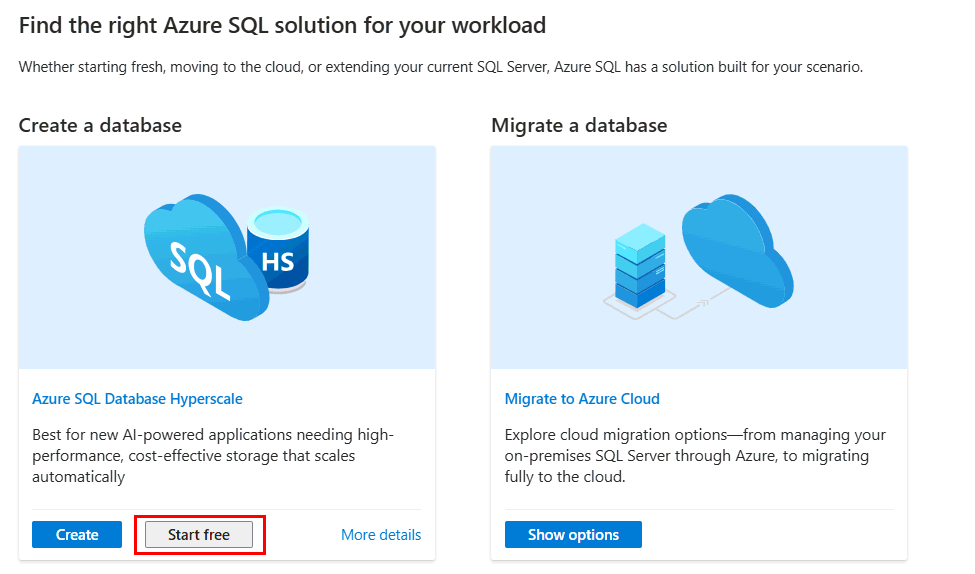 To get started and quickly create a new free Azure SQL Database, visit the Azure SQL hub at aka.ms/azuresqlhub. In the Create a database pane, select the Start free link.