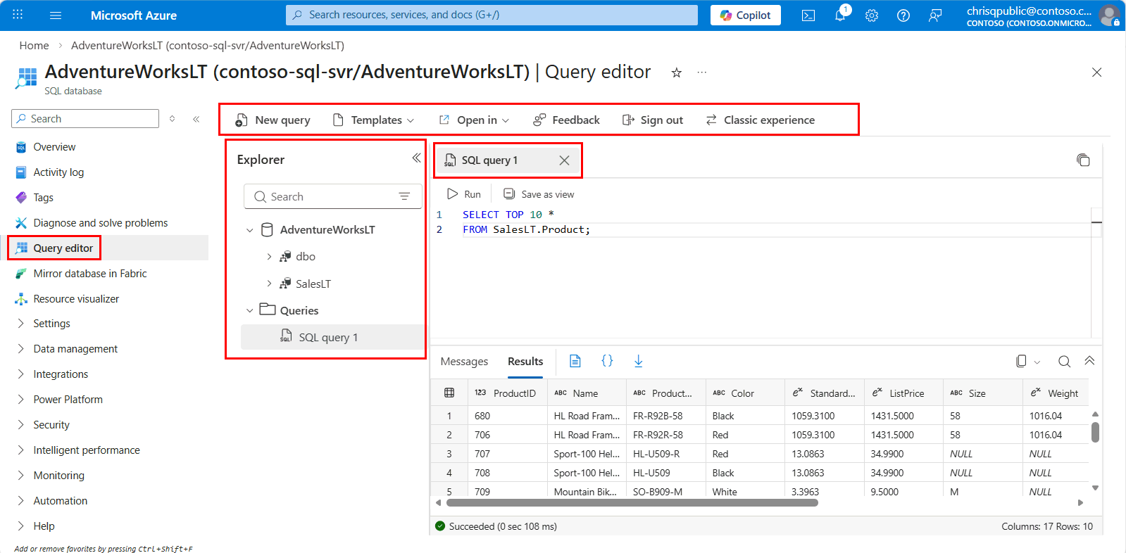 Once connected to the query editor experience, you can use the Explorer to view database objects or the Query window to execute T-SQL queries.