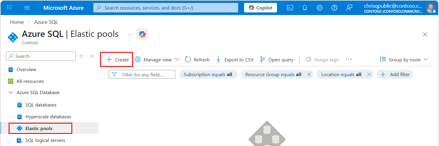 In the Azure SQL Database options window, select Create SQL Elastic pool.