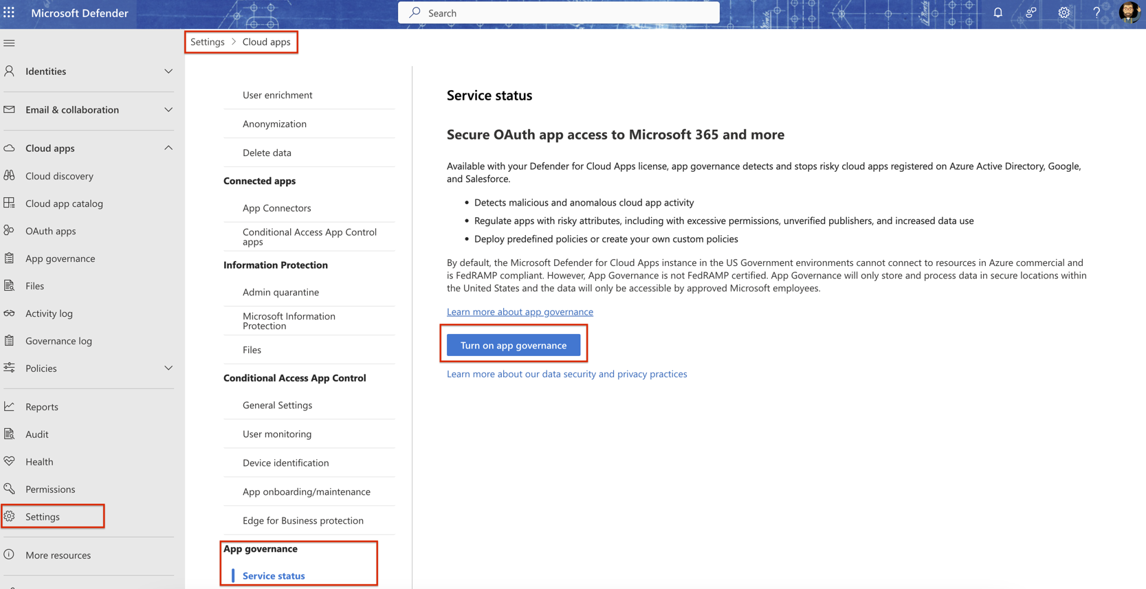This article describes how to turn on Microsoft Defender for Cloud Apps app governance.
