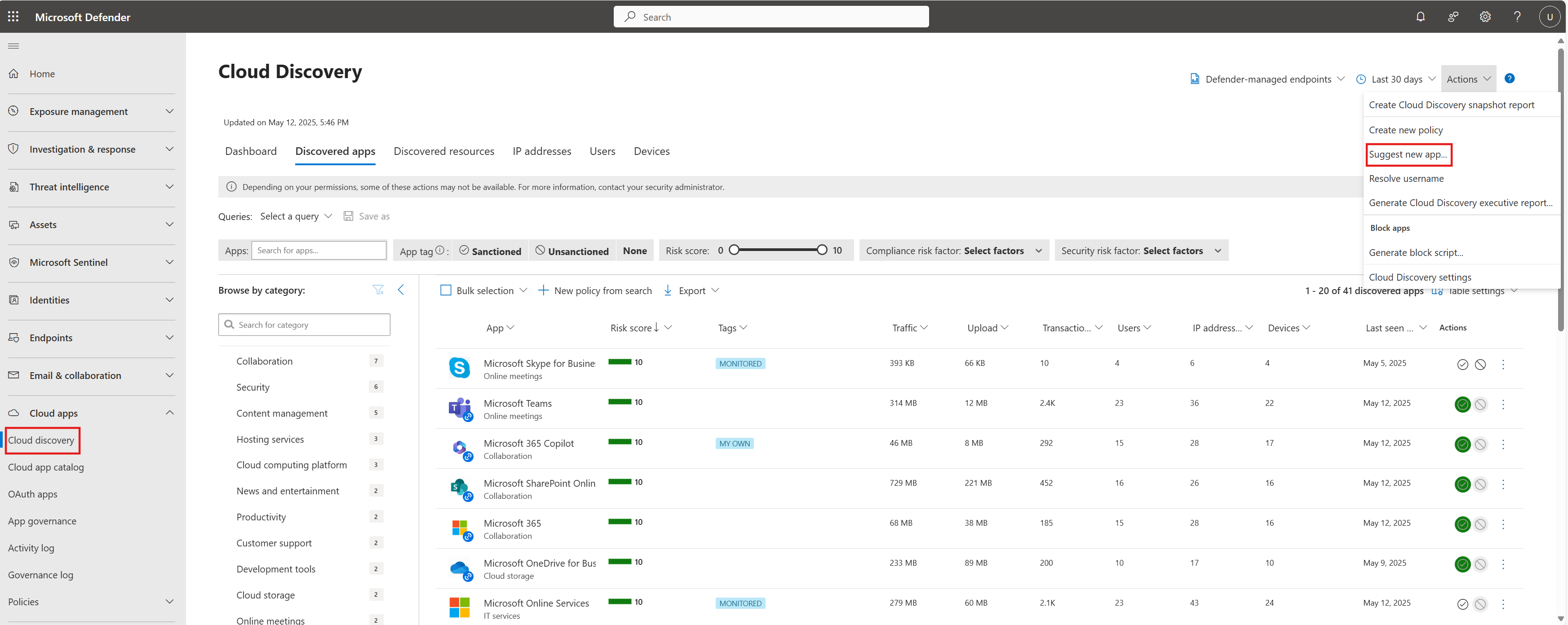 On the Cloud Discovery page, on the Discovered apps tab, select Actions and then choose Suggest new app.
