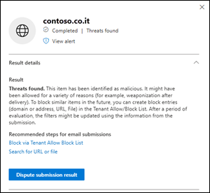 Select Block this URL: This option creates a block entry for the URL in the Tenant Allow/Block List. For more information about the Tenant Allow/Block List, see Manage allows and blocks in the Tenant Allow/Block List.