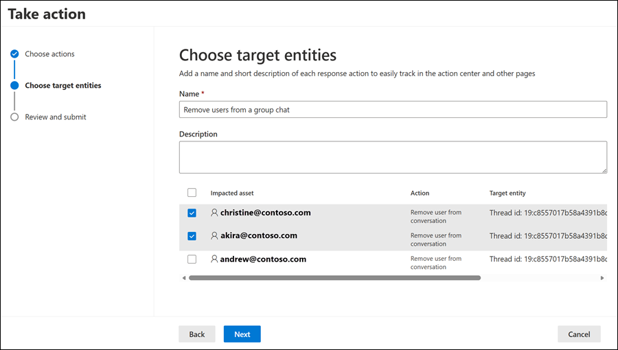 On the Choose response actions page, select Remove user from conversation from the Conversation level actions section, and then select Next.