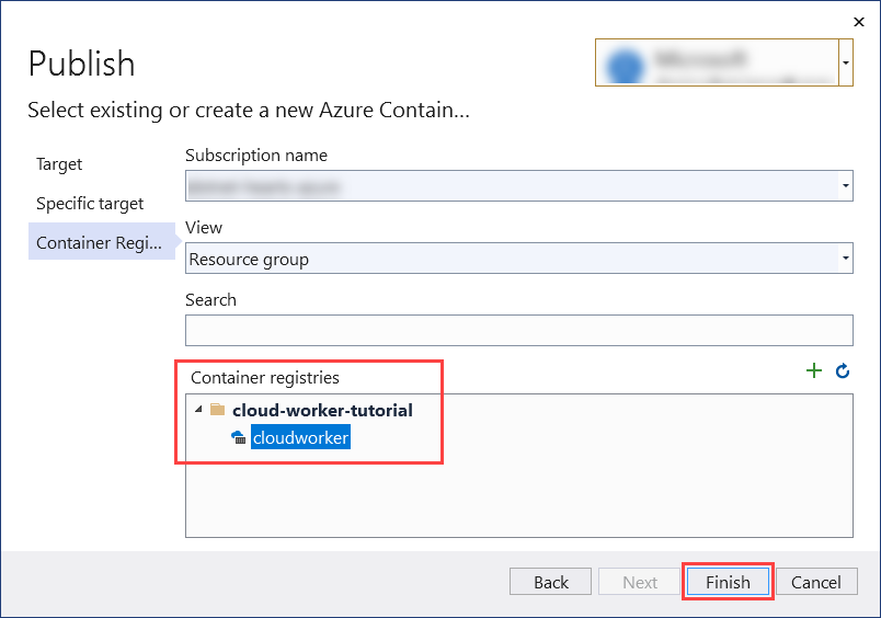 Next, for the Container Registry, select the Subscription name that you used to create the ACR resource. From the Container registries selection area, select the container registry that you created, and then select Finish.