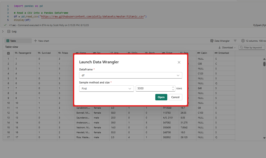 - Launch Data Wrangler from your Fabric notebook