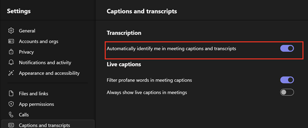 You can optionally tell users to go verify that it's turned on by going to in the Teams app to Settings > Captions and transcripts > Automatically identify me in meeting captions and transcripts and make sure it's turned on.