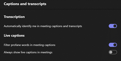 - DisabledUserOverride: Speakers are not identified in the transcription. If enabled, users can change this setting and choose to be identified in their Teams profile settings.