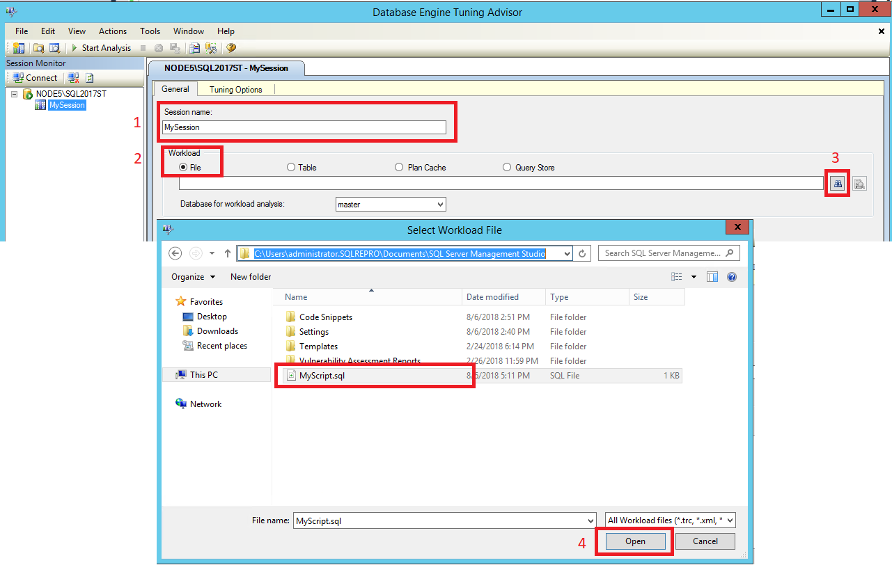 MyScript.sqlin a directory where you can easily find it. An example that works against theAdventureWorksdatabase is provided in the following code.USE [AdventureWorks2022]; GO -- Might need to modify database name to match database SELECT DISTINCT pp.LastName, pp.FirstName FROM Person.Person AS pp INNER JOIN HumanResources.Employee AS e ON e.BusinessEntityID = pp.BusinessEntityID WHERE pp.BusinessEntityID IN ( SELECT SalesPersonID FROM Sales.SalesOrderHeader WHERE SalesOrderID IN ( SELECT SalesOrderID FROM Sales.SalesOrderDetail WHERE ProductID IN ( SELECT ProductID FROM Production.Product AS p WHERE ProductNumber = 'BK-M68B-42')));Start Database Engine Tuning Advisor. Select Database Tuning Advisor from the Tools menu in SQL Server Management Studio (SSMS). For more information, see Launch Database Engine Tuning Advisor. Connect to your SQL Server in the Connect to Server dialog box.