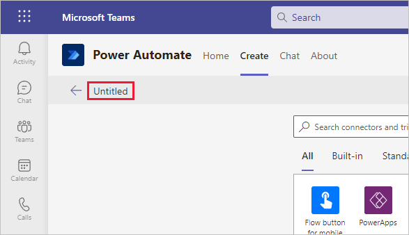 4. Notice how Power Automate initiates a new flow within Teams. Rename your flow by selecting the word Untitled in the upper left of the menu bar and type in a name. Next, we create the flow.