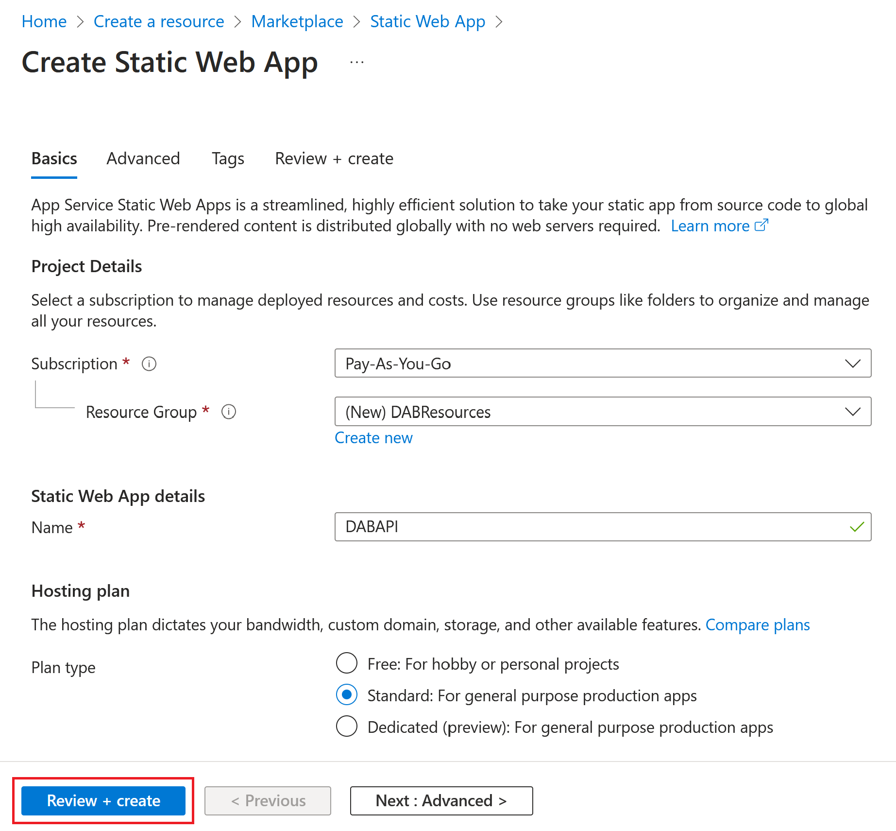 Далі виберіть свою підписку та виберіть існуючу групу ресурсів або створіть нову. У текстовому полі Ім'я введіть описову назву додатка. Вам потрібно вибрати тип Плану. Для особистих проєктів ви можете використовувати безкоштовний план, тоді як для виробничих програм рекомендується використовувати стандартний план.
