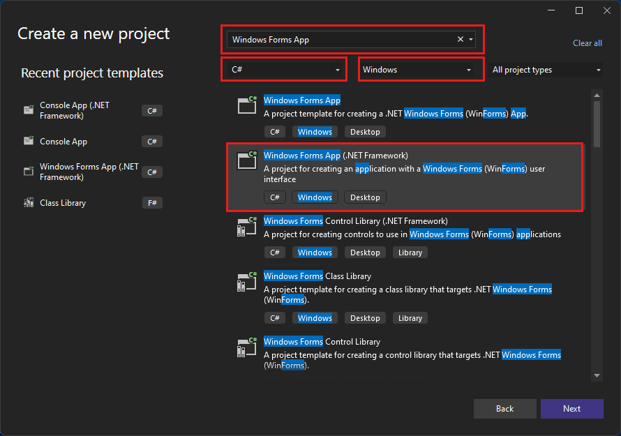 In Create a new project, select the Windows Forms App (.NET Framework) template for C#.