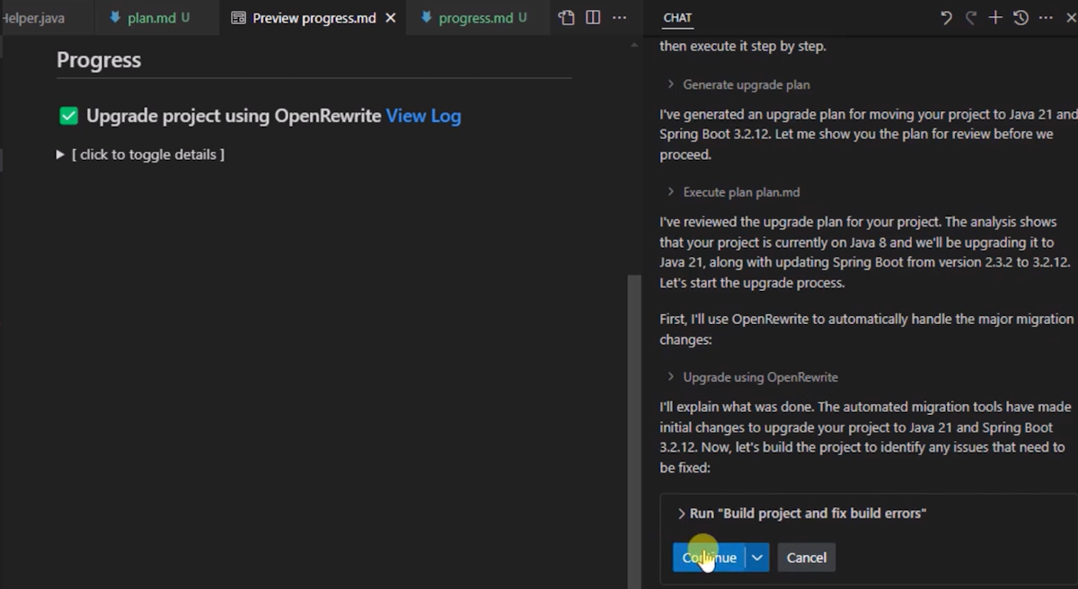 GitHub Copilot then proceeds with the code transformation phase of the project. It uses an open-source tool called OpenRewrite to implement some code changes based on specific recipes. Then, AI addresses the remaining issues through a dynamic build/fix loop. You can monitor progress in the editor area of Visual Studio Code by checking the progress.md markdown file at any time.