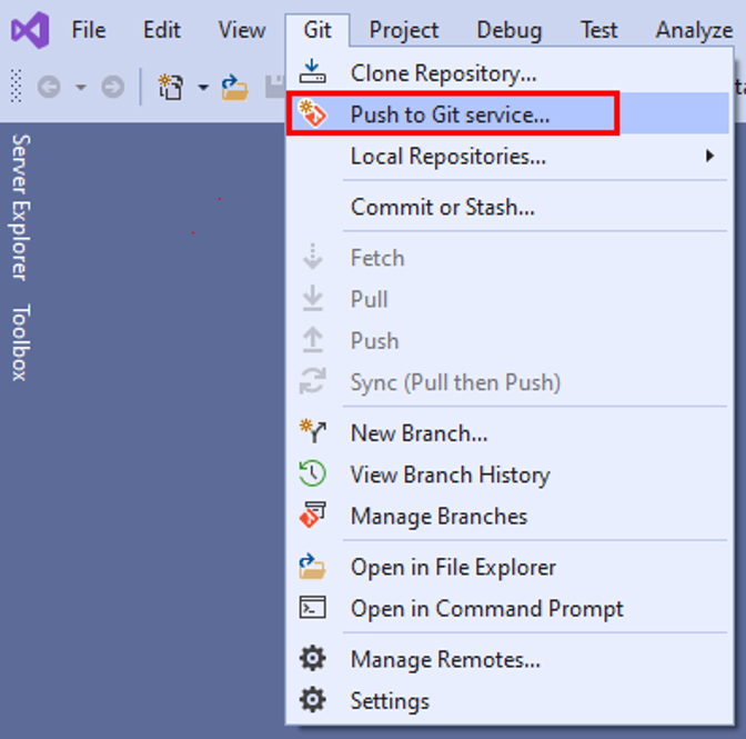 Connect to an Azure DevOps repo by right-clicking the solution name in Solution Explorer, and then selecting Push to Git service to launch the Create a Git repository window.