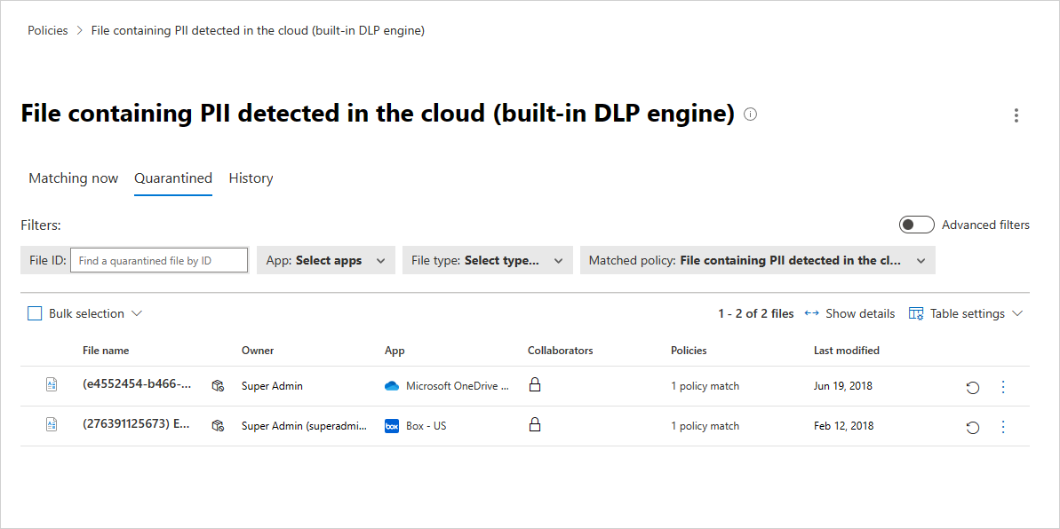 When you receive the alert that a file has been quarantined, go to Policies -> Policy Management. Then select the Information Protection tab. In the row with your file policy, choose the three dots at the end of the line, and select View all matches. This brings you the report of matches, where you can see the matching and quarantined files:
