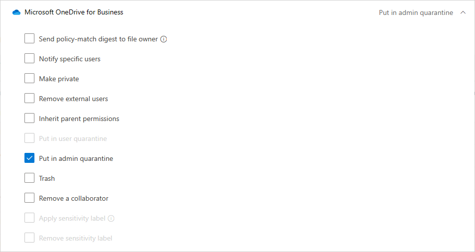 For Microsoft 365 SharePoint or OneDrive for Business, you can't put files in admin quarantine as part of a policy until you set it up: