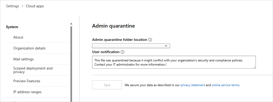 To set admin quarantine settings, in the Microsoft Defender Portal, select Settings. Then choose Cloud Apps. Under Information Protection, choose Admin quarantine. Provide a site for the quarantine folder location and a user notification that your user will receive when their file is quarantined.