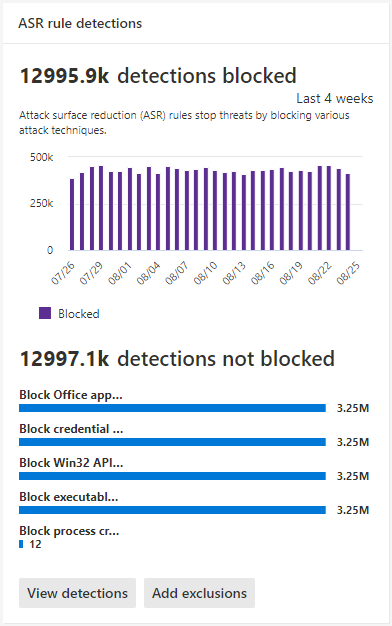 - Detections: The total number of detected events for named file. Individual devices can trigger multiple ASR rules events.