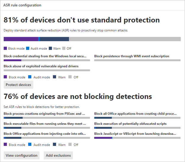 The configuration summary card provides a button to Protect devices with the three standard protection rules. At minimum, Microsoft recommends that you enable these three attack surface reduction standard protection rules:
