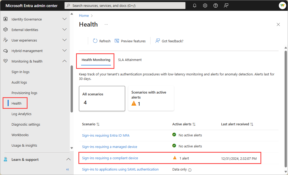 Microsoft Entra Health monitoring provides a set of tenant-level health metrics you can monitor and alerts when a potential issue or failure condition is detected. There are multiple health scenarios that can be monitored, including two related to devices:
