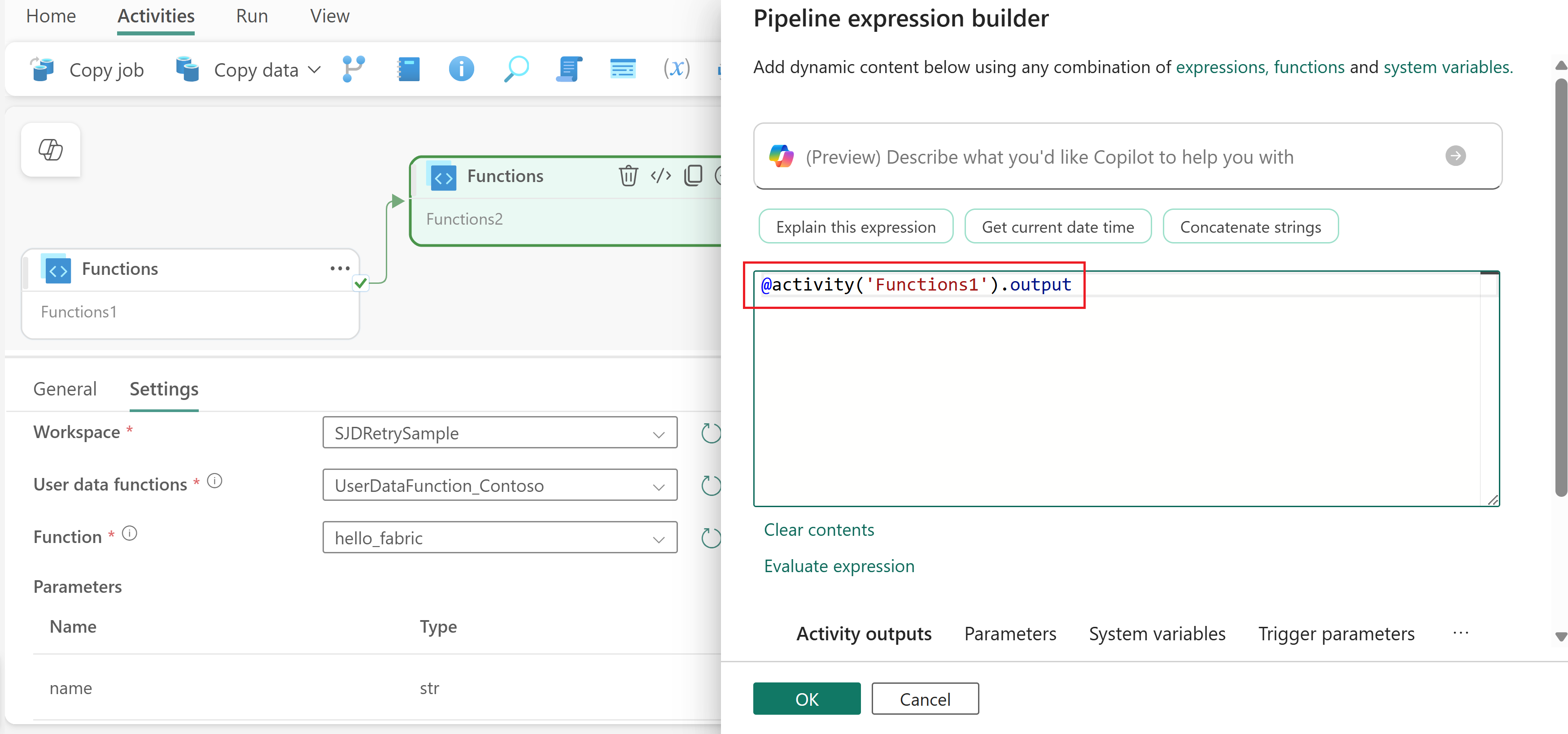 Fabric pipelines provide a visual way to orchestrate data movement and transformation activities. In this section, you create a pipeline and add a Functions activity to it. In a later section, you configure the activity specifically for user data functions.