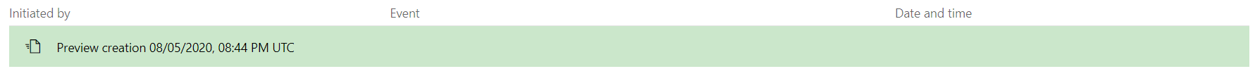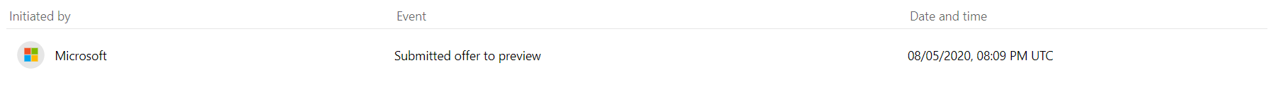 | Initiated submit to preview cancellation | A user requested to cancel the offer publication to preview by selecting Cancel publish from the Offer overview page after the submission to preview. This event is displayed as the cancellation request is being processed. |