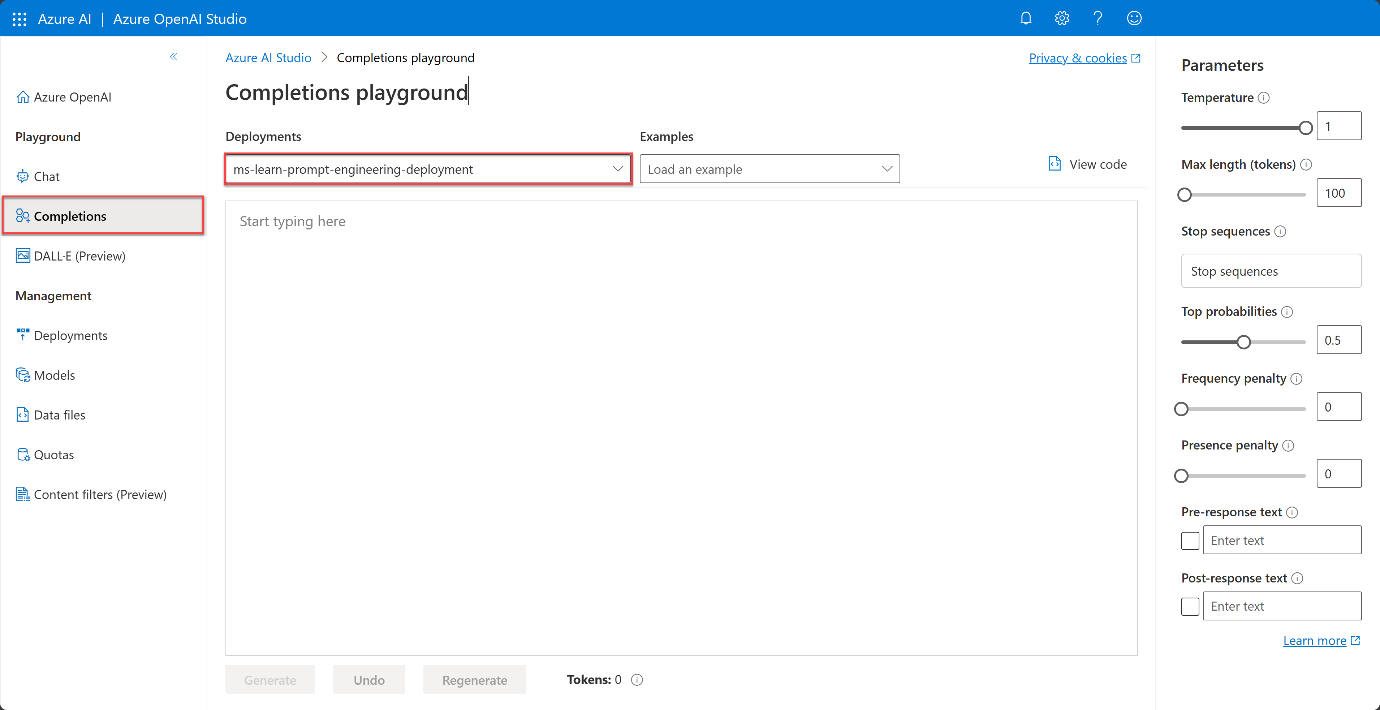 Trong bài tập này, bạn sử dụng ngôn ngữ tự nhiên để tương tác với việc triển khai Azure OpenAI trong sân chơi hoàn thành.