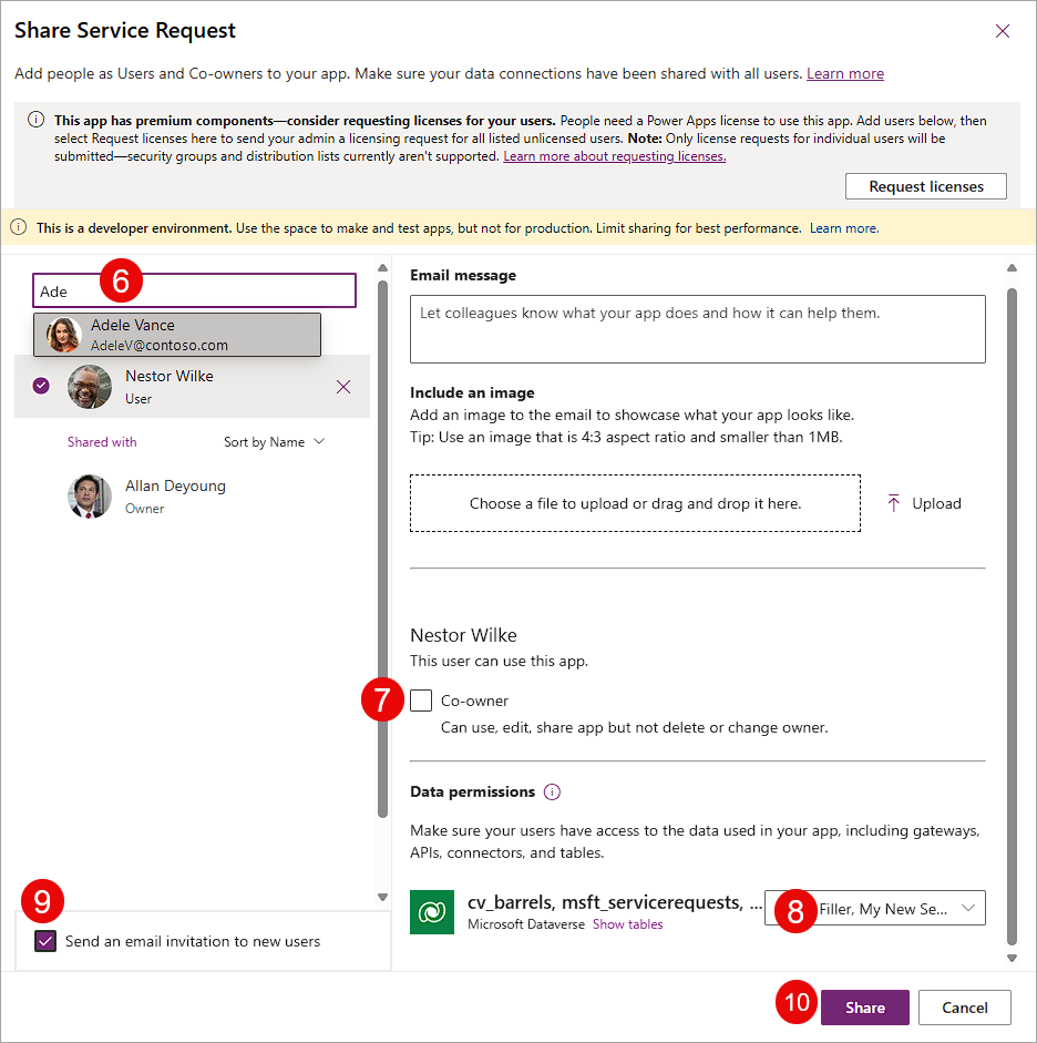 Continue to add users via the same process. When complete, select Share. Power Apps will notify you that sharing was successful. Select Cancel to close the sharing panel.