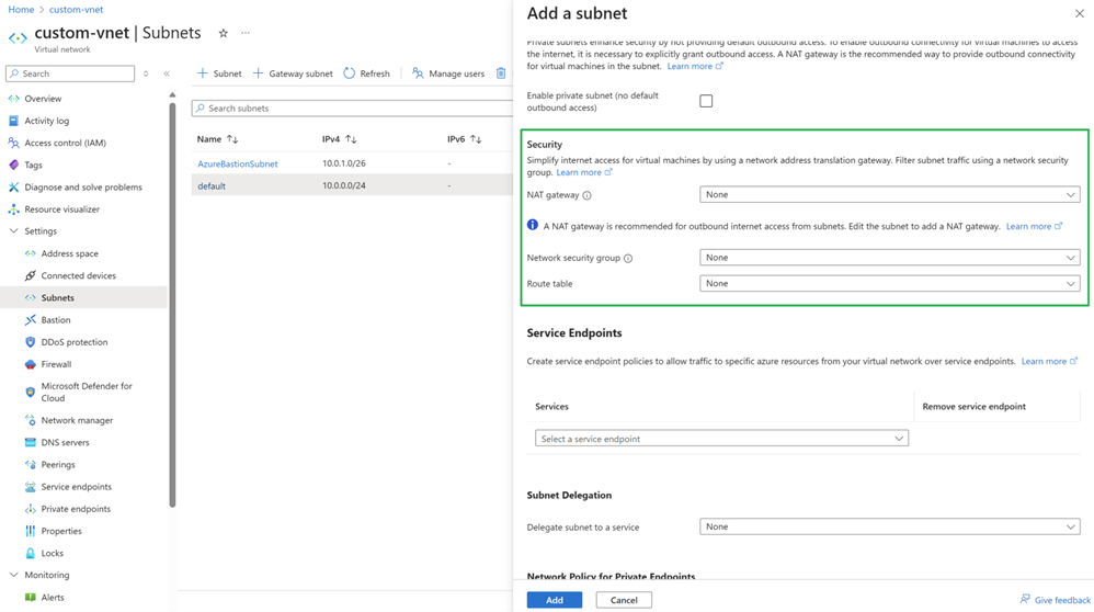 按照快速入门:创建 NAT 网关 - Azure 门户和创建、更改或删除 Azure 网络安全组文档,创建新的 NAT 网关和新的网络安全组。