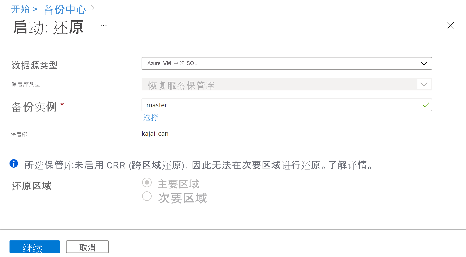 只有支持 CRR 功能的备份管理类型才会显示在列表中。 目前,只允许将次要区域数据还原到次要区域。