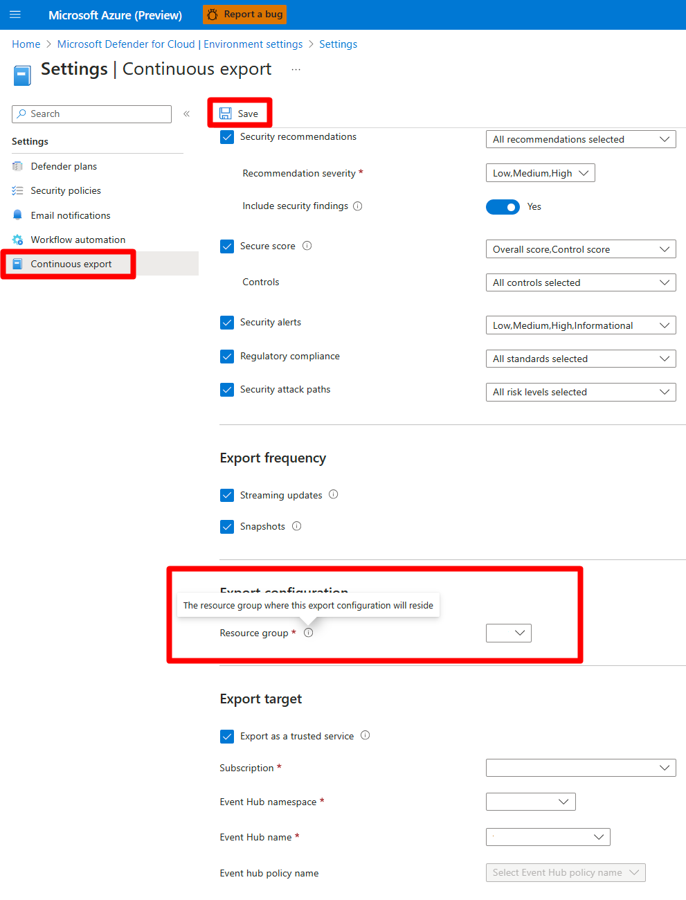 可以在 Azure 门户的 Microsoft Defender for Cloud 页面中设置连续导出、使用 REST API,或通过提供的 Azure Policy 模板大规模应用此功能。