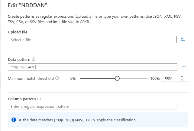 配置与数据模式匹配的数据可接受的 最小匹配阈值 参数,以应用分类。 阈值可以为 1% 到 100%。 建议将值至少设置为 60% 作为阈值,以避免误报。 但是,可以根据需要针对特定分类方案进行配置。 例如,如果要检测数据中的任何值并应用分类(如果该值与模式匹配),则阈值可能低至 1%。