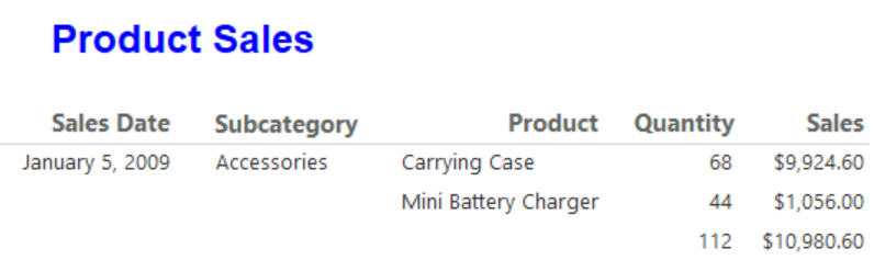 确认 SalesDate 列中显示的值仅为日期(月、日、年)。 以下是一个报表示例: