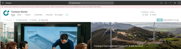 | 在强制只读期限后存档站点 | 网站所有者或网站管理员收到三个月的每月通知。 如果通知收件人在此期间未将网站标记为已认证,则网站在可配置的持续时间 (3、6、9 或 12 个月) 进入只读模式。 在配置的月份数之后,站点将通过 365 存档 Microsoft存档。 必须在 Microsoft 365 管理中心 中启用 Microsoft 365 存档。 |