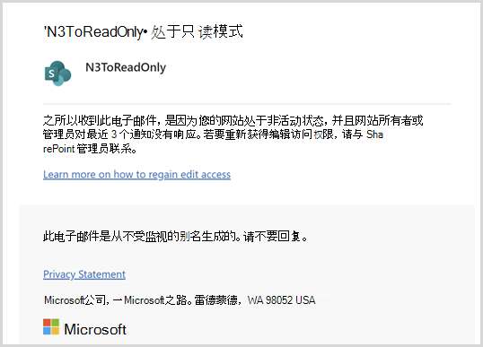 配置了只读强制作的非活动站点策略会发送其他通知,以在没有响应时通知网站所有者或网站管理员。
