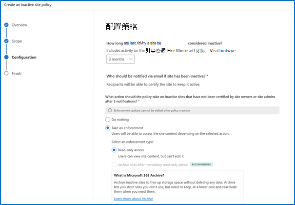 强制作 策略行为 不执行任何作 网站所有者或网站管理员收到三个月的每月通知。 在此期限过后,未来三个月不会发送通知。 如果网站在六个月后保持无人参与,则每月通知会恢复。 策略执行报告将网站所有者未执行作的无人参与的网站列出。 可以下载此报告,并筛选出标记为未采取行动的网站。 只读访问权限 网站所有者或网站管理员收到三个月的每月通知。 如果通知收件人在此期间未将网站标记为已证明,则网站将进入只读模式。 在强制只读期限后存档站点 网站所有者或网站管理员收到三个月的每月通知。 如果通知收件人在此时间段内未将网站标记为已证明,则网站会在可配置的持续时间 (3、6、9 或 12 个月) 进入只读模式。 在配置的月份数之后,站点将通过 365 存档 Microsoft存档。 存档受在 Microsoft 365 管理中心 中启用 Microsoft 365 存档的租户的约束。 以下屏幕截图显示了为站点证明策略配置强制作的示例: