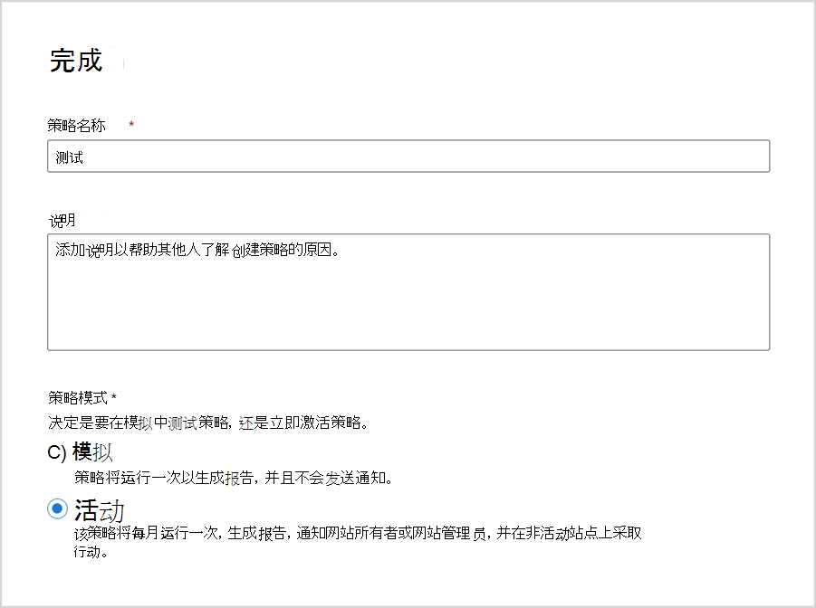 在 “完成” 步骤中,指定策略的名称和说明,然后选择策略模式。 然后选择“ 完成”。