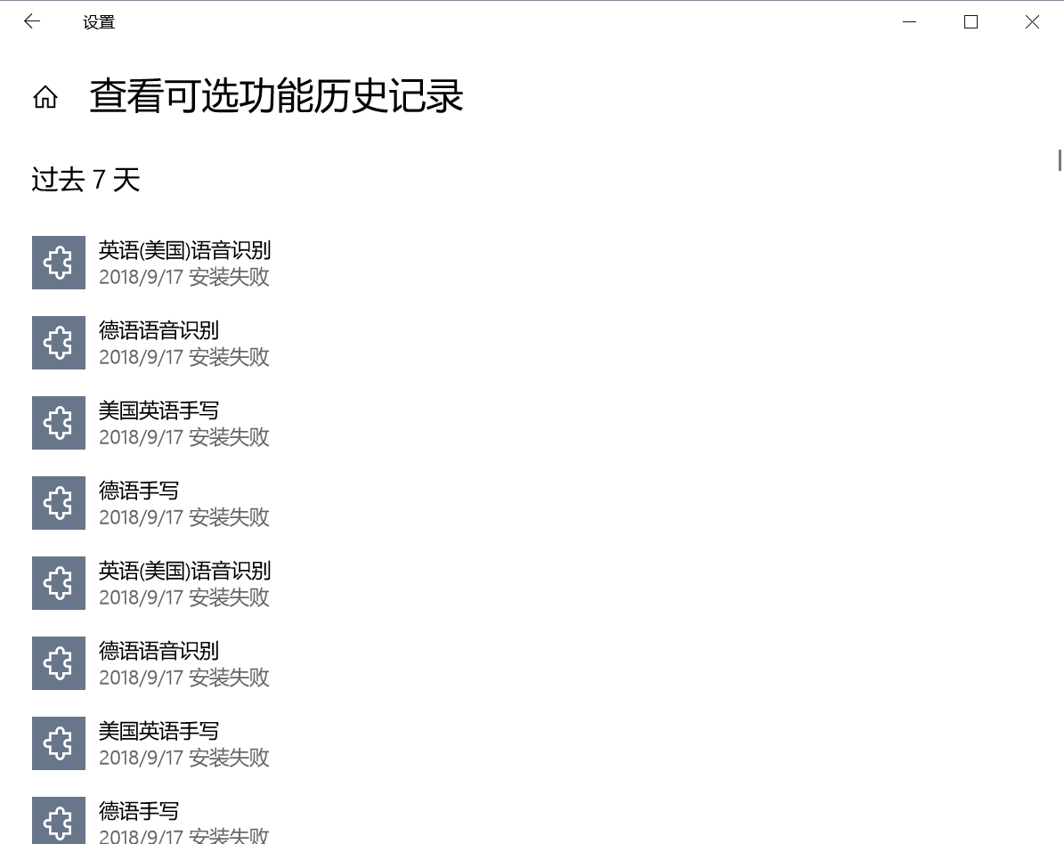 结果自此以后,电脑似乎自动开始下载我电脑中已有输入法的手写和语音识别,并且每次都失败,隔一小段时间就出现相同的弹窗(见上图)。我的依据在于,点击弹窗进入“管理可选功能”,再点击“查看可选功能历史记录”显示如下: