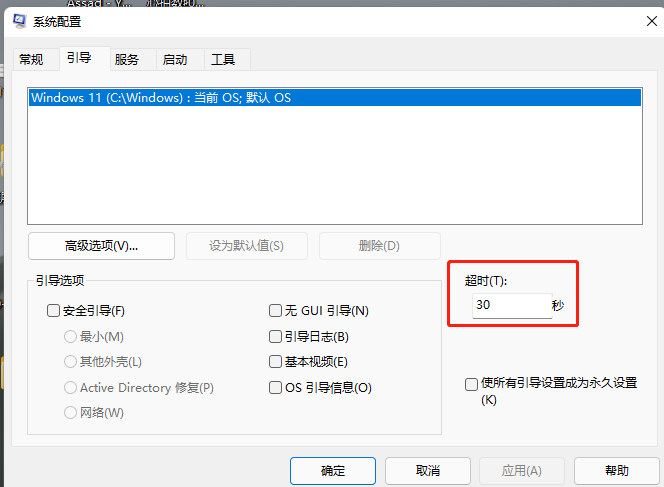 若是有多个系统,将会显示,可以修改超时为30秒,重启时将有较多的时间选择系统。
