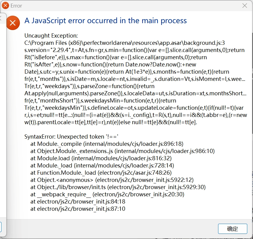 多个软件在打开时出现a java script error问题(如图,该图为打开完美世界竞技平台软件出现的窗口),尝试过社区以前出现这个问题的帖子解决方式未能成功,请问怎么解决?