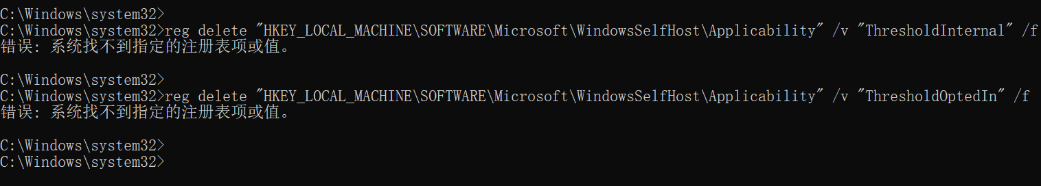 reg delete "HKEY_LOCAL_MACHINE\SOFTWARE\Microsoft\WindowsSelfHost\Applicability" /v "ThresholdOptedIn" /f