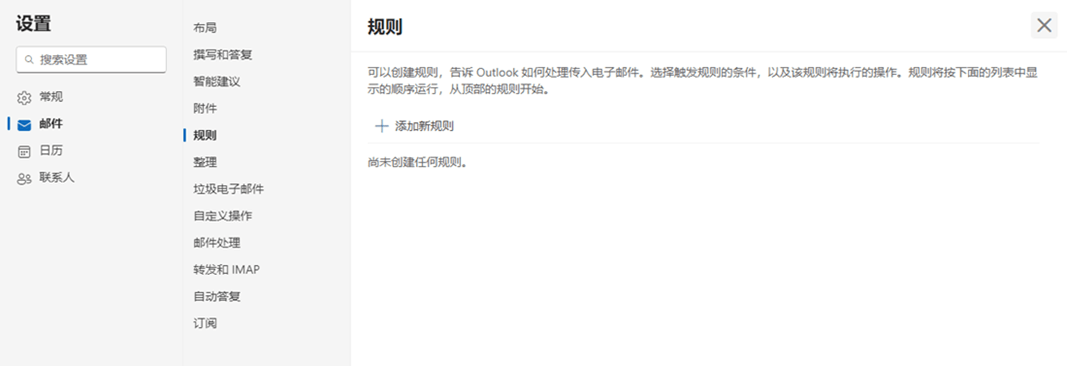 - 您可以在设置-邮件-规则中检查是否存在一些规则影响了您的邮箱账户来接收验证邮件,如果有这样的规则,您可以暂时删除这些规则,然后检查您是否能正常接收验证邮件。