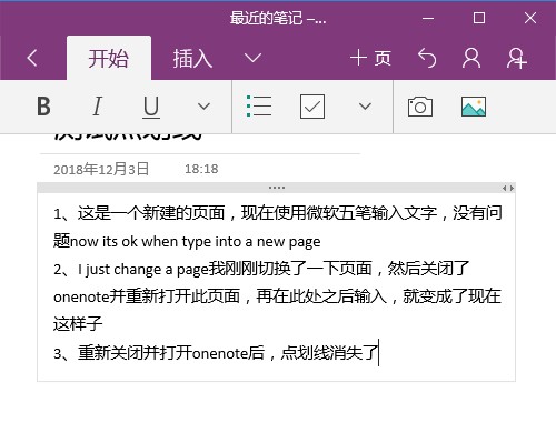 我用以下截图中演示的步骤,基本还原出了问题发生的情形。虽然没有导致内容损失,但每次出现点划线都让人很不舒服。不过也不是每次这样操作都会有问题,大致就是需要文本里既有中文又有英文,然后切换到别的页面关掉,那么下次再打开此页面时就很容易出现这种现象。当然,感觉上只是UI的渲染出了问题,我把有虚线的部分剪切+粘贴后,虚线也会消失不见。