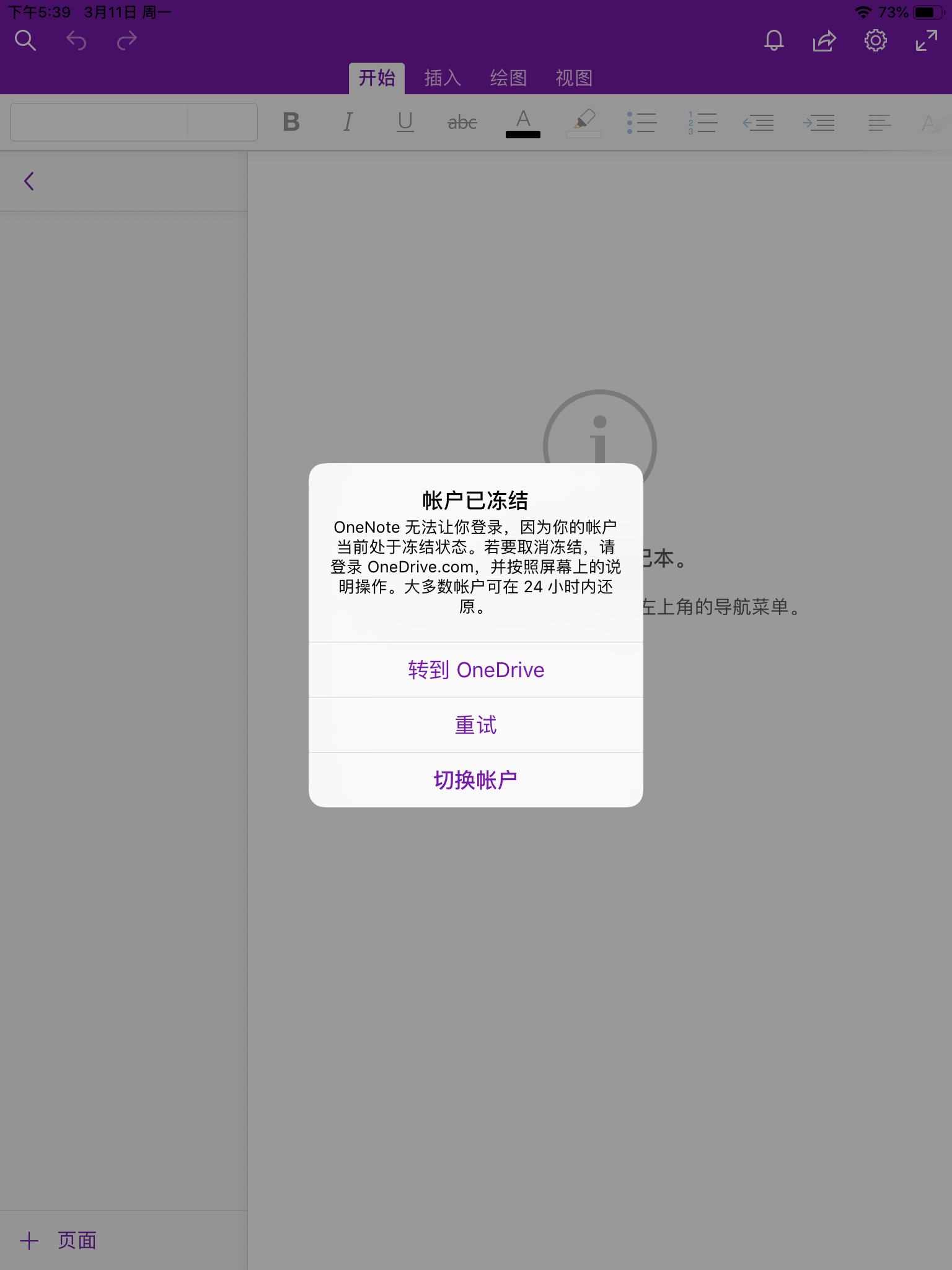 使用浏览器尝试访问Onedrive.com(国内网络环境下需要使用VPN),看下该账户登陆访问该位置是否存在显示账户冻结的问题。如果是,请按照网页端提示的内容,进行解冻操作,完成后再尝试使用Onenote,看下效果。