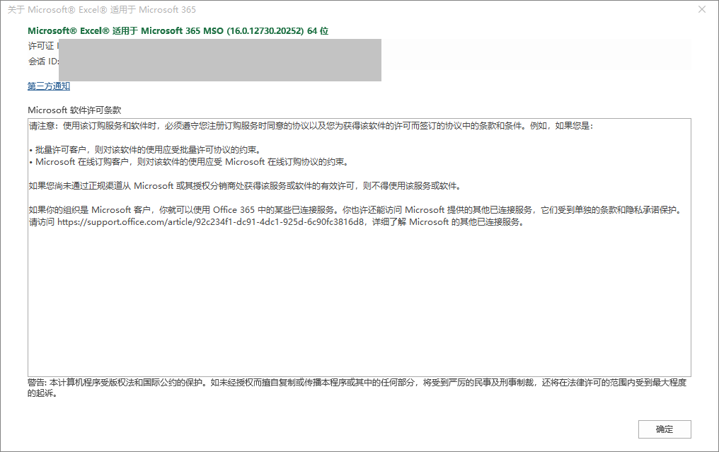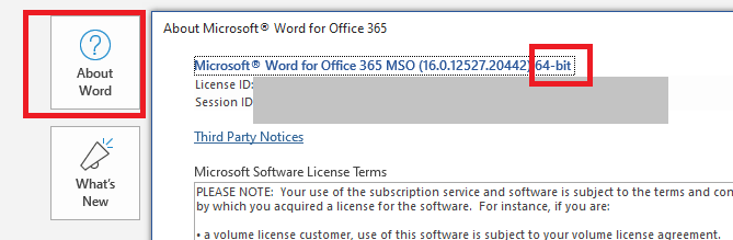 另外,根据“当前操作系统无法运行此程序”这个报错,似乎是您Office客户端位数导致在一些功能在您Windows 系统上不能运行。比如您在64位Windows 系统上运行32位的Office客户端,可能会在某些功能方面有一定的限制。确保您的当前运行的64位系统安装的是64位的Office客户端。关于查看Office客户端的位数,您可以在文件>账户>点击关于Office中查看。