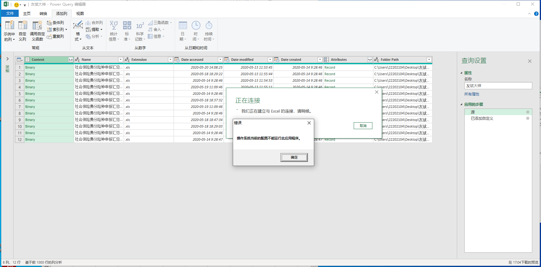 excel正常功能能够适用,power query编辑器能正常打开,在新建自定义列时,就会报警:当前操作系统无法运行此程序