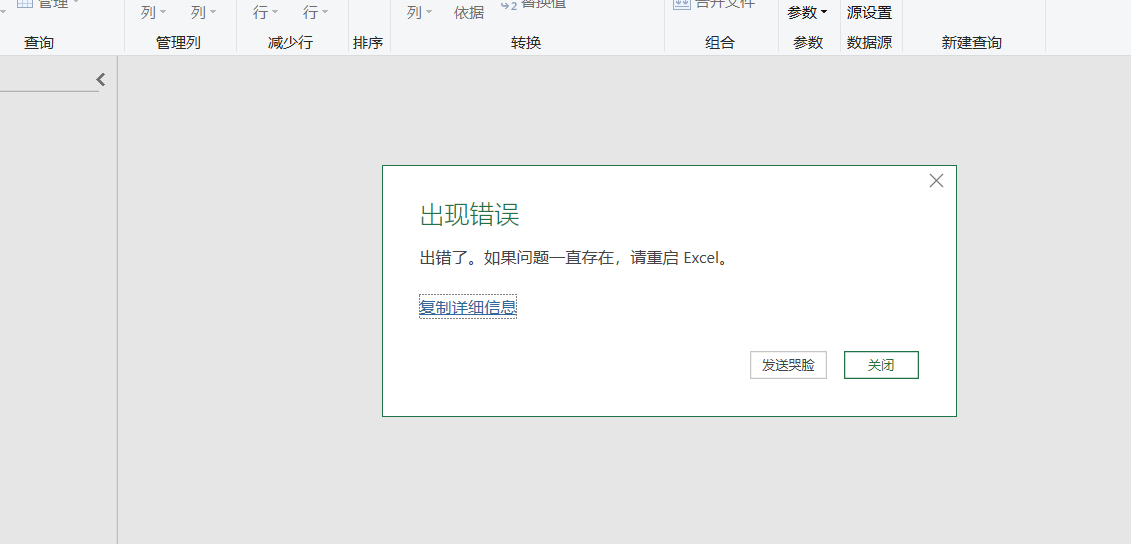 在 Microsoft.Mashup.Client.Excel.Native.NativeUserFeedbackServices.RaiseErrorDialog(IWindowHandle activeWindow, IUIHost uiHost, FeedbackPackageInfo feedbackPackageInfo, Exception e, LocalizedString dialogTitle, LocalizedString dialogMessage, Boolean useGDICapture)