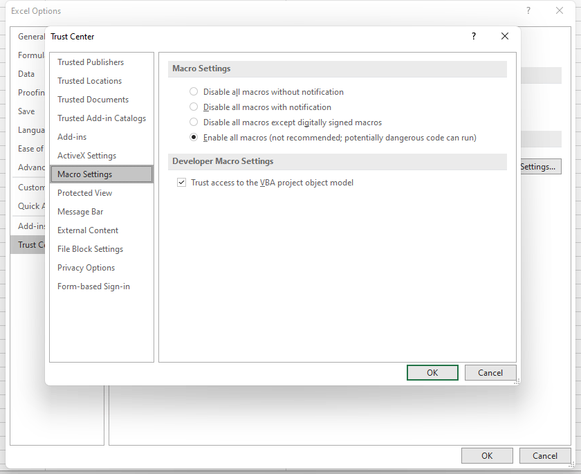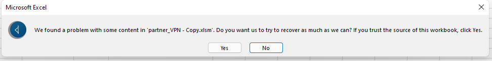 We found a problem with some content in '***.xlsm'. Do you want us to try to recover as much as we can? If you trust the source of this workbook, click Yes.